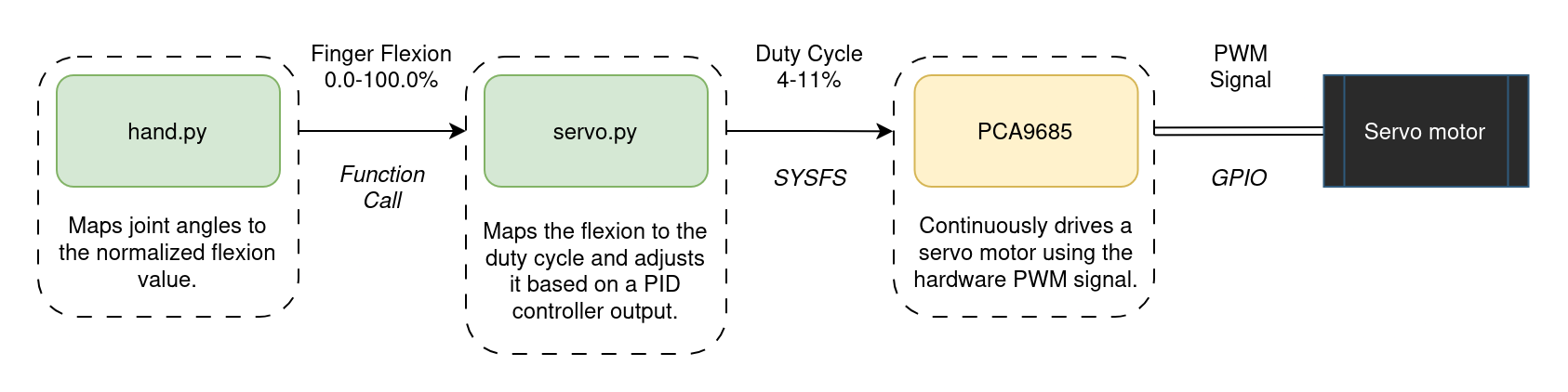 Originally, we tried controlling the servos via GPIO using software PWM. This worked well – until it didn’t. Timing issues caused jitter, especially when multiple servos moved simultaneously under high system load, leading to poor behavior and unpredictable finger movements. This was particularly problematic for the bionic hand, which has multiple servos that need to move in sync to accurately mirror the user's hand gestures. Switching to the PCA9685 hardware PWM controller solved this.