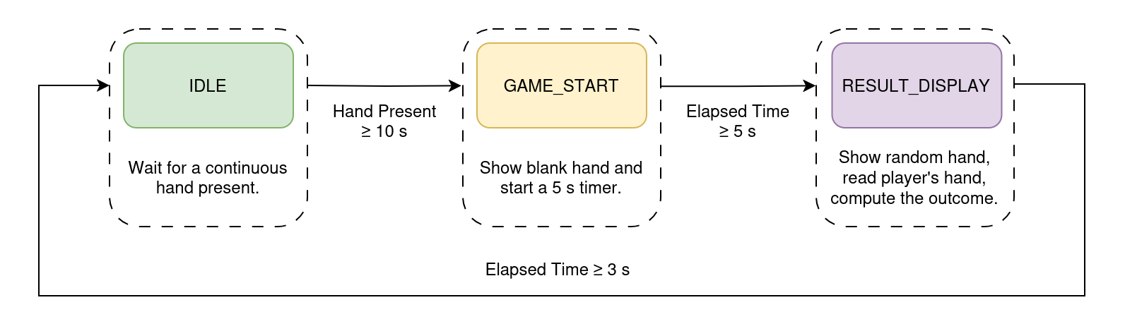When a hand is detected for more than 10 seconds, the system switches to the rock-paper-scissors game mode. The robot hand stops mirroring the user's hand and instead performs a random gesture. The outcome of the game is determined by comparing the user's gesture with the robot's gesture. After the result is displayed, the system returns to the normal operation mode, where the robot hand mimics the user's hand.