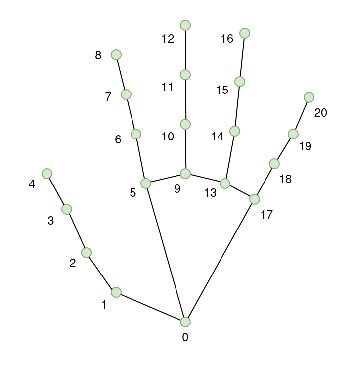 All images are annotated with per-hand bounding boxes [x, y, width, height], 21 hand landmarks [x, y], gesture labels, and user ID. The dataset includes joint landmarks for hand pose detection. Each hand has a total of 21 keypoints. They are annotated as follows: